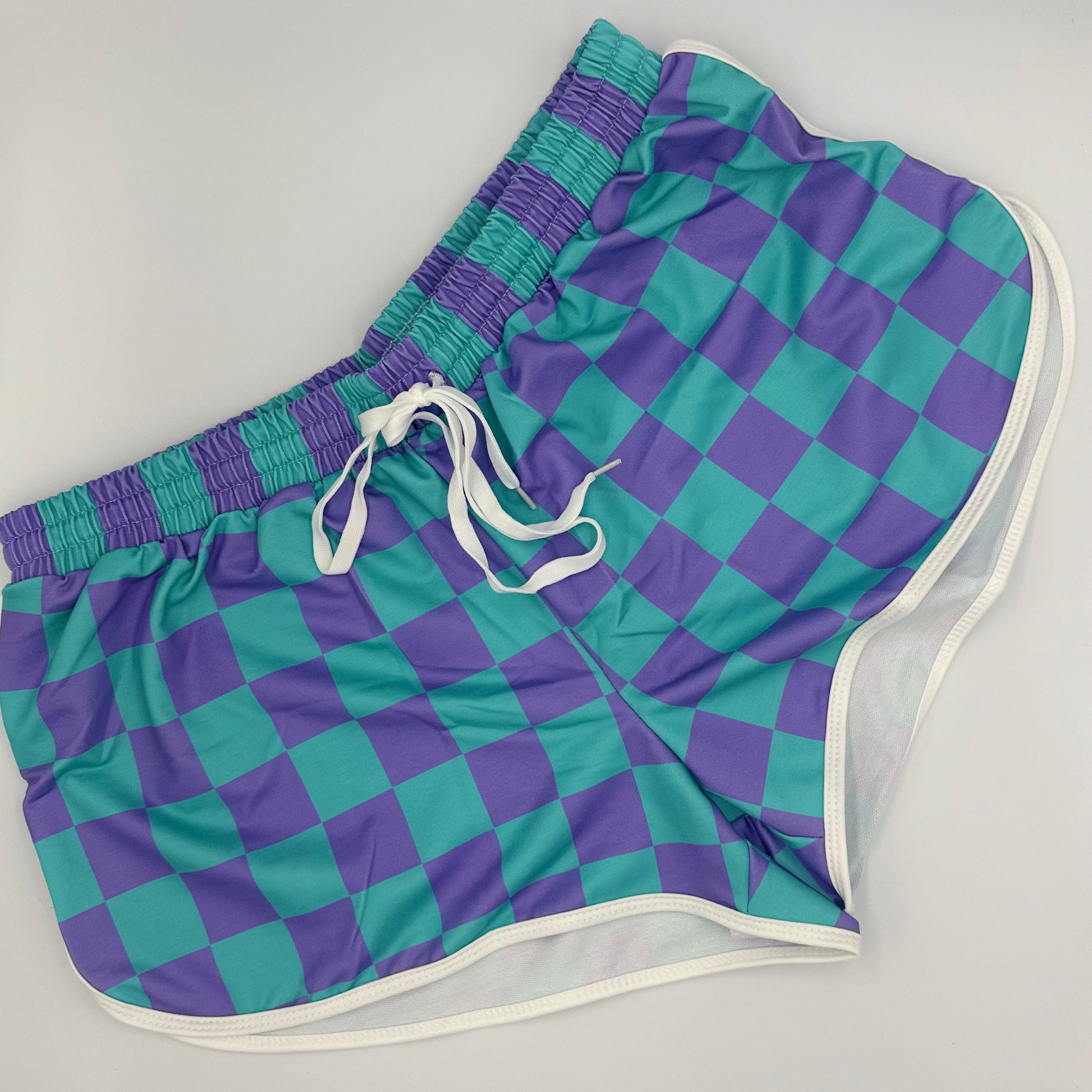 - Eye-catching blue & purple checkerboard — because plain shorts are boring