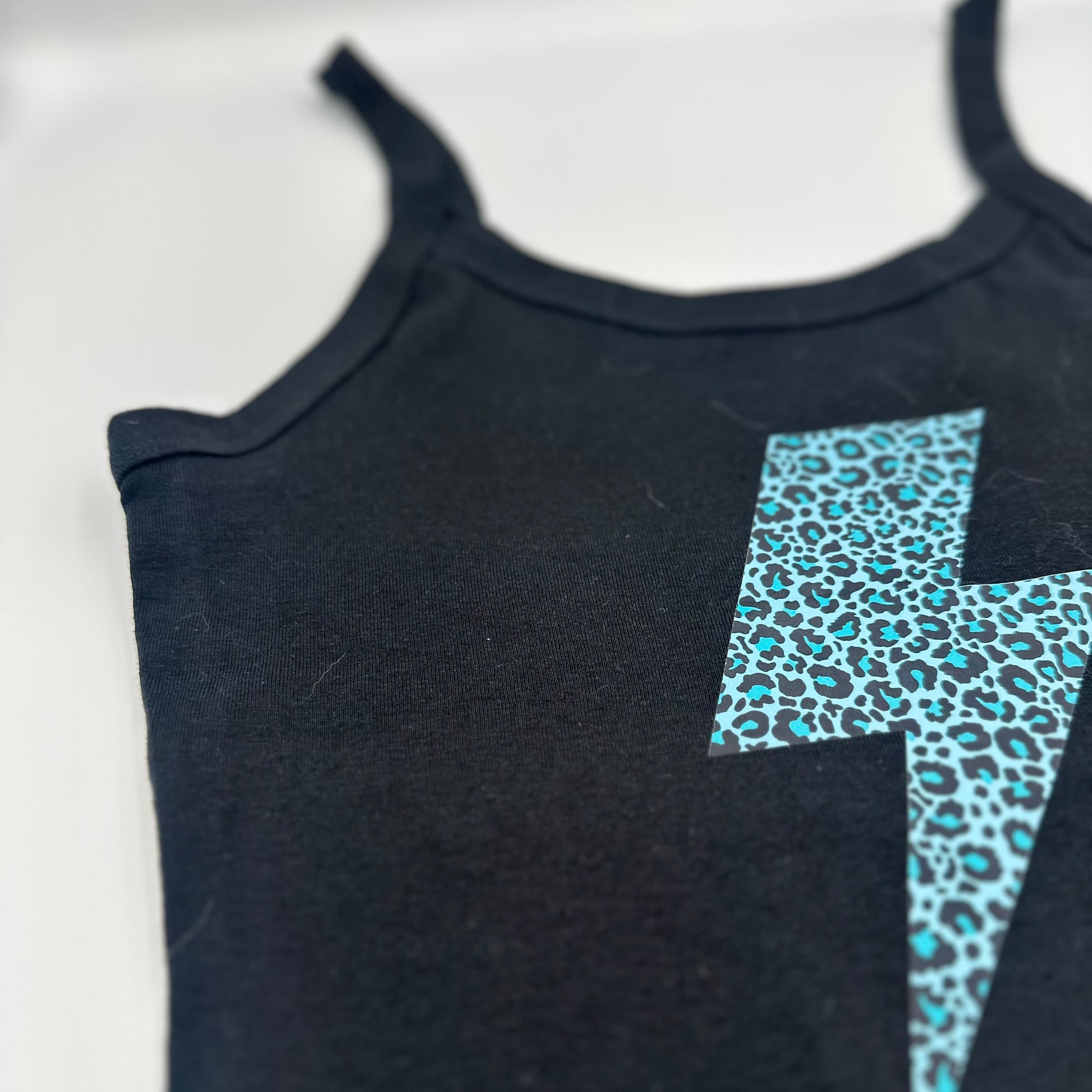 Add a shock of style to your wardrobe with this lightning bolt crop top. Featuring a teal leopard print bolt on a sleek black tank, this piece blends retro grunge vibes with modern festival flair. Perfect for: • 🎶 Concerts, festivals, and raves • 🖤 Everyday alt-girl streetwear • ✨ Layering with mesh tops or oversized flannels • 📸 Statement outfit for nights out